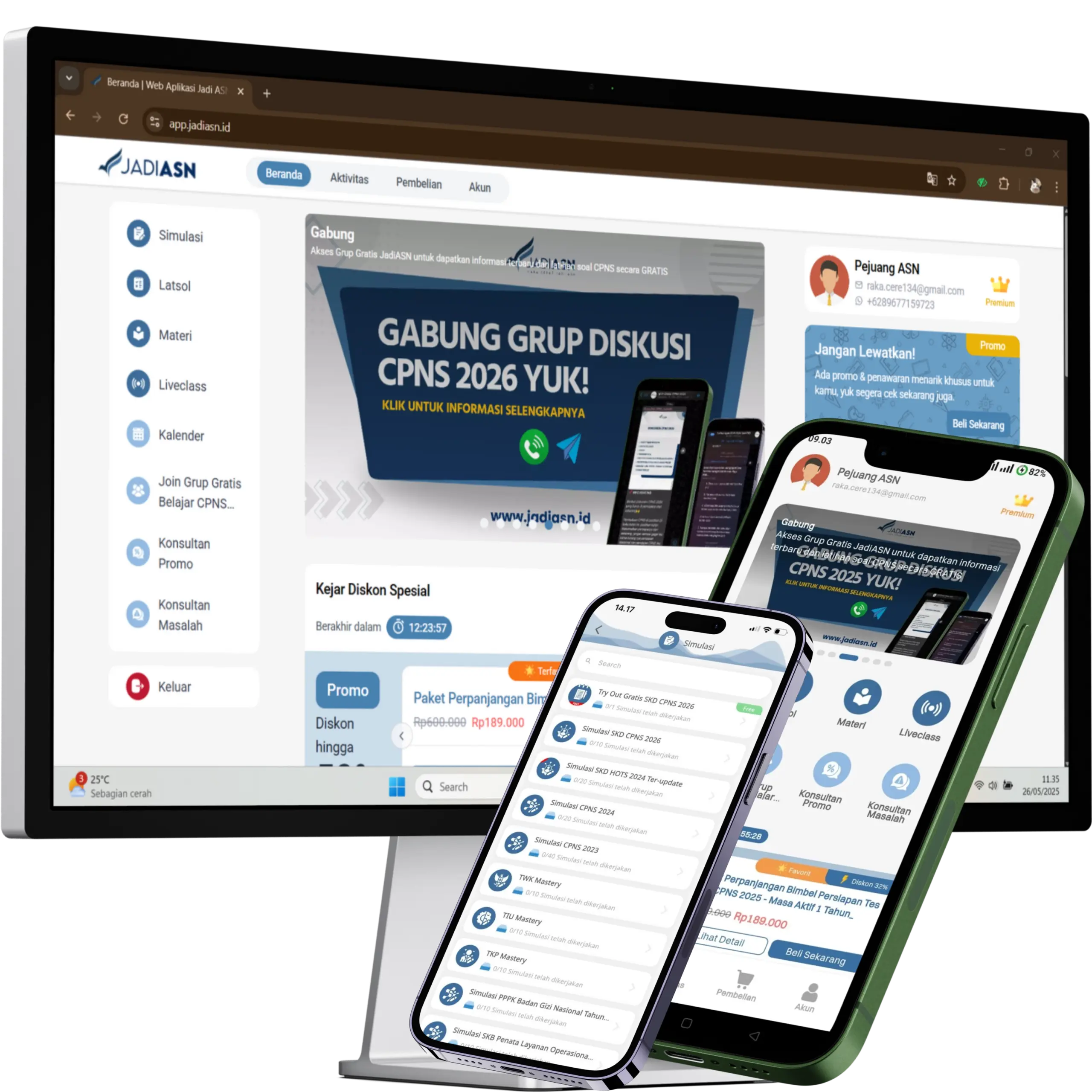 Aplikasi JadiASN dapat diakses melalui mobile (HP/ponsel) dan laptop/komputer. Kamu bisa belajar kapan saja lewat versi aplikasi di ponsel atau langsung melalui web browser di laptop sesuai kebutuhan belajar kamu.