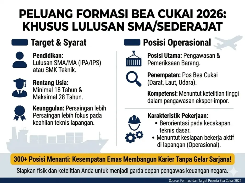 Direktorat Jenderal Bea dan Cukai tengah mempersiapkan pembukaan pendaftaran seleksi Calon Pegawai Negeri Sipil (CPNS) tahun 2026 dengan fokus khusus kepada lulusan SMA/sederajat. Peluang ini menawarkan sekitar 300-380 formasi bagi tenaga operasional teknis lapangan, sebuah langkah yang secara strategis dirancang untuk memenuhi kebutuhan langsung di lapangan tanpa harus bersaing ketat dengan lulusan sarjana.
