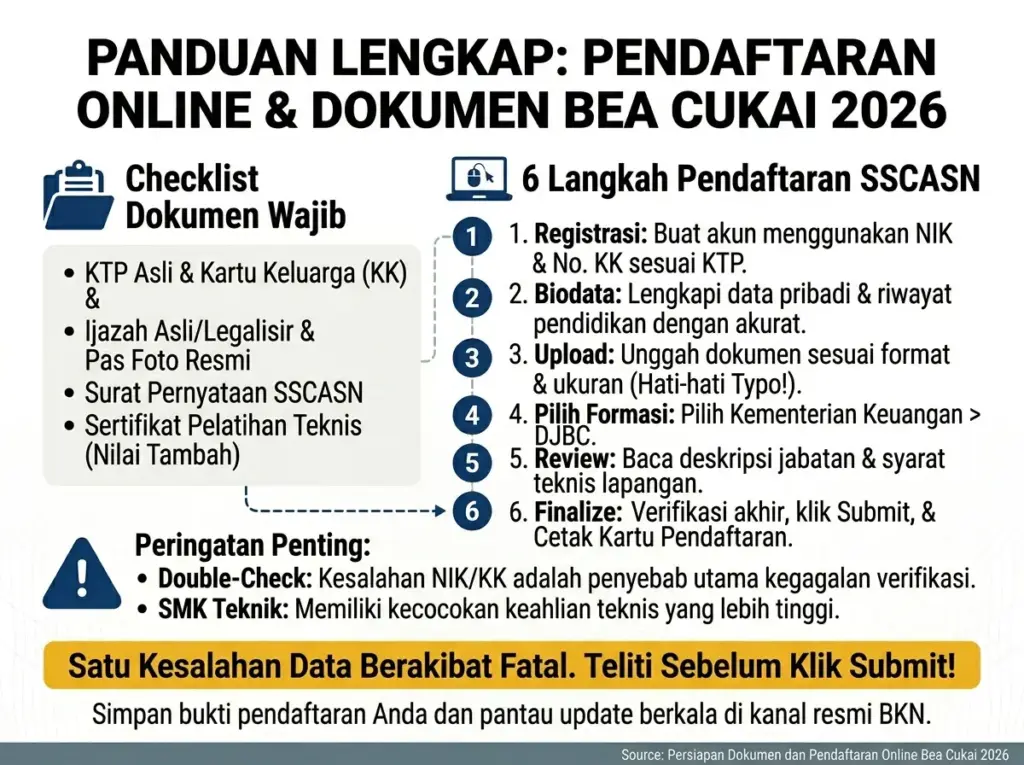 Penting bagi peserta untuk mempersiapkan dokumen lengkap supaya tidak gagal pada tahap verifikasi administrasi. Dokumen wajib meliputi KTP asli, Kartu Keluarga, ijazah asli atau legalisir, pas foto resmi, surat pernyataan dari portal SSCASN, serta sertifikat pelatihan teknis jika ada. Apa risiko jika data tersebut tidak tepat?