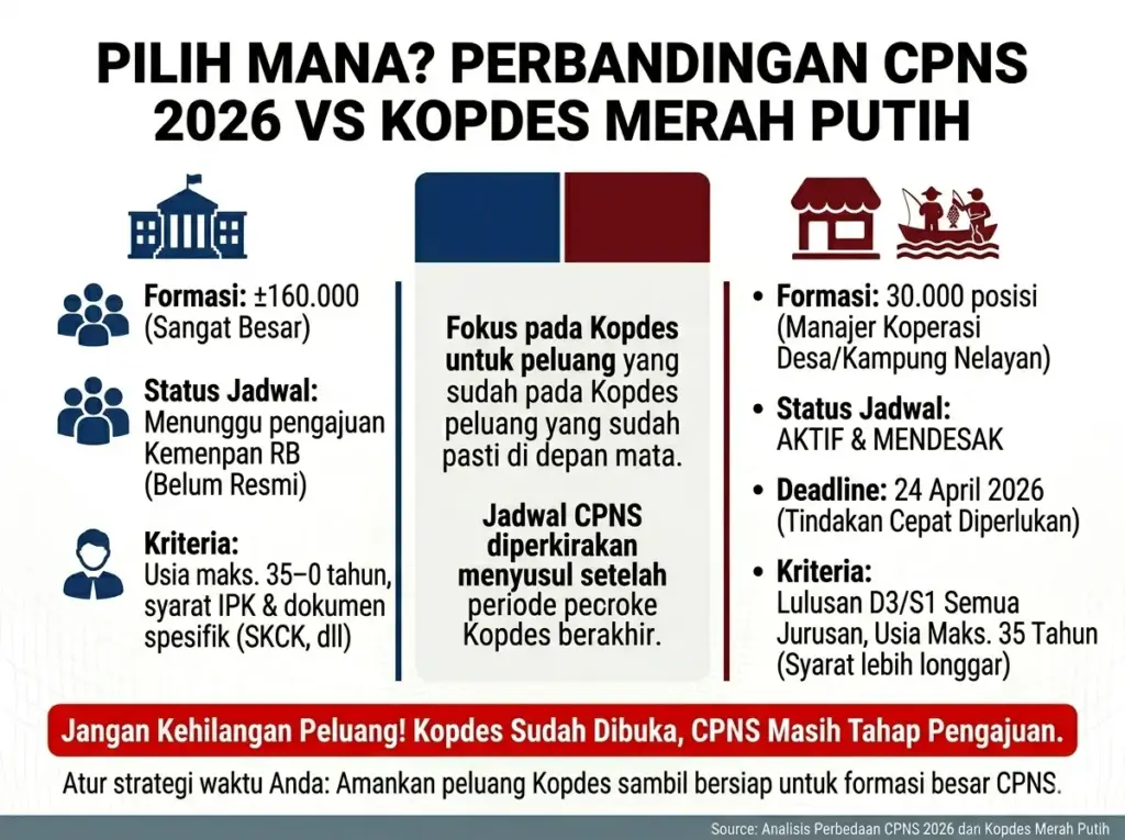 CPNS 2026 menawarkan sekitar 160.000 formasi, jumlah yang sangat besar dan menjanjikan peluang luas. Namun, instansi terkait masih dalam proses pengajuan kebutuhan ke Kemenpan RB sehingga jadwal resmi belum ada. Sebaliknya, Kopdes Merah Putih membuka 30.000 posisi yang spesifik untuk manajer koperasi desa dan kampung nelayan dengan pendaftaran yang sudah aktif. Ini menandakan jadwal Kopdes lebih pasti dan mendesak untuk direspons segera.