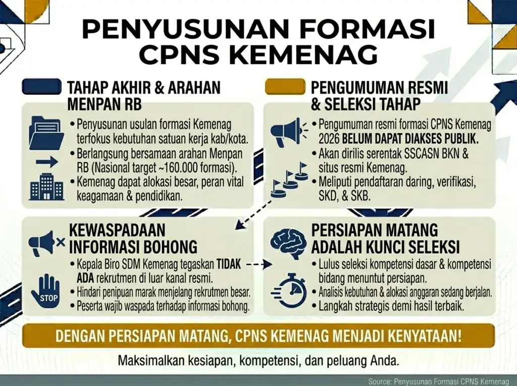Kementerian Agama saat ini tengah dalam tahap akhir menyusun usulan formasi CPNS yang terfokus pada kebutuhan nyata tiap satuan kerja di tingkat kabupaten dan kota. Tahap ini berlangsung bersamaan dengan arahan dari Menpan RB yang menargetkan pembukaan sekitar 160.000 formasi CPNS nasional, dan Kemenag mendapat alokasi cukup besar berkat perannya yang vital di bidang keagamaan dan pendidikan.