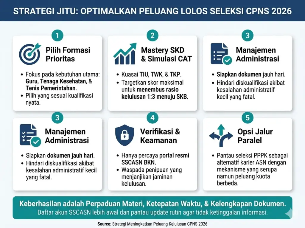 Dengan persiapan matang baik secara teknis maupun administratif, peluang lolos CPNS 2026 akan semakin terbuka lebar. Keberhasilan bukan hanya soal kemampuan materi, tetapi juga ketepatan waktu dan dokumen yang lengkap.