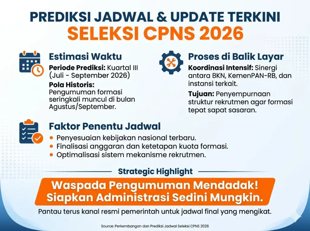 Pemerintah diperkirakan akan membuka pendaftaran CPNS 2026 secara serentak pada pertengahan tahun atau kuartal ketiga, yaitu antara Juli hingga September. Pola ini sesuai dengan praktik selama beberapa tahun terakhir yang biasanya mengumumkan formasi dan pendaftaran dalam rentang Agustus-September. Namun, hingga saat ini, belum ada jadwal final yang dipublikasikan secara resmi.