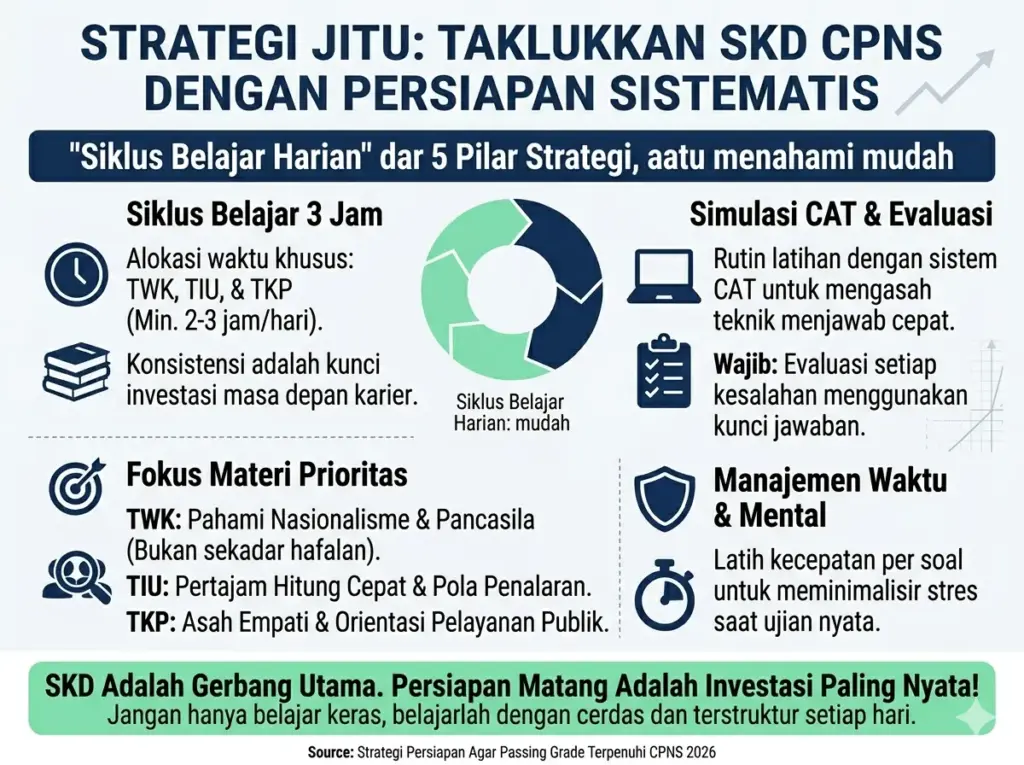 Strategi persiapan SKD CPNS harus sistematis dan disiplin. Langkah pertama adalah membuat jadwal belajar yang terstruktur dengan alokasi waktu khusus untuk TWK, TIU, dan TKP. Idealnya peserta mengatur waktu belajar minimal dua sampai tiga jam per hari dengan pembagian porsi yang seimbang sesuai kebutuhan kemampuan masing-masing.