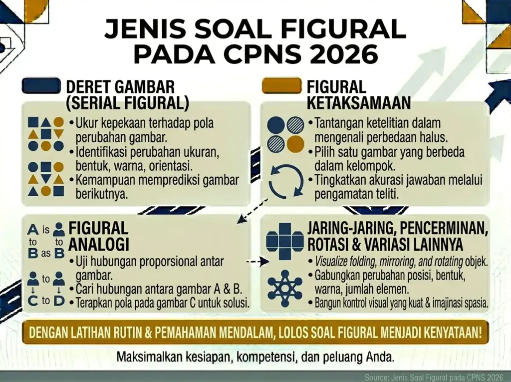Seleksi Kompetensi Dasar (SKD) merupakan tahap penting bagi siapa saja yang ingin menjadi Aparatur Sipil Negara (ASN) melalui CPNS atau PPPK. Salah satu jenis soal yang sering membuat peserta bingung adalah soal figural. Soal jenis ini menuntut kemampuan peserta dalam mengenali pola visual, logika spasial, serta transformasi gambar secara tepat. Tekanan waktu yang ketat pada sesi TIU menuntut setiap peserta memiliki strategi belajar yang tepat untuk menguasai soal-soal tersebut demi lolos SKD tahun 2026.