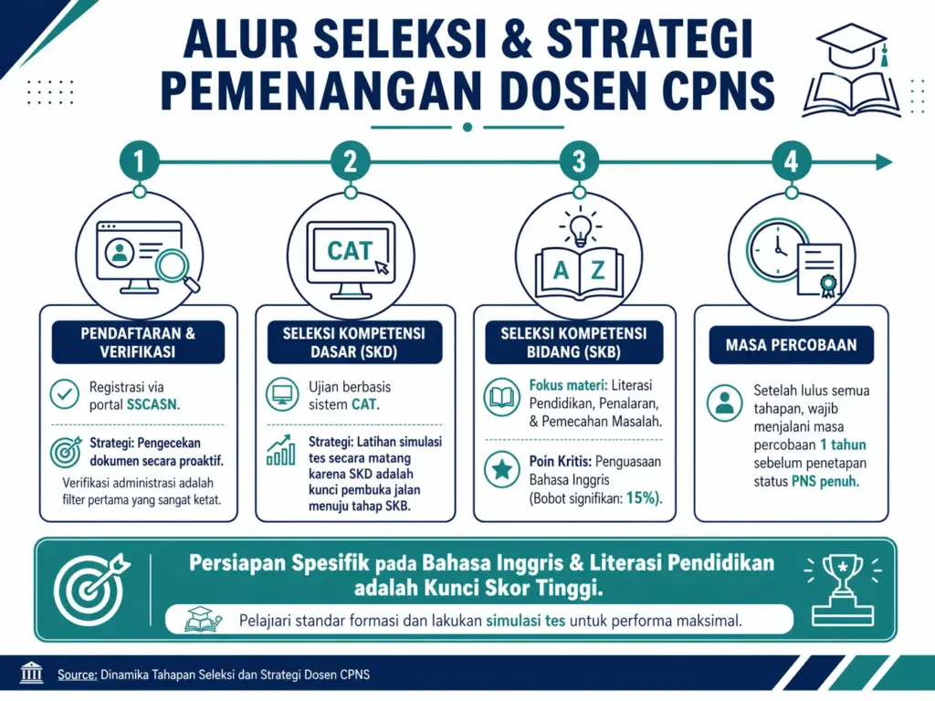 Seleksi CPNS dosen mengikuti prosedur umum ASN, tetapi dengan penyesuaian khusus pada materi ujian dan verifikasi yang lebih ketat. Pertama-tama, calon harus mendaftar pada portal SSCASN dan memilih formasi dosen yang sesuai.
