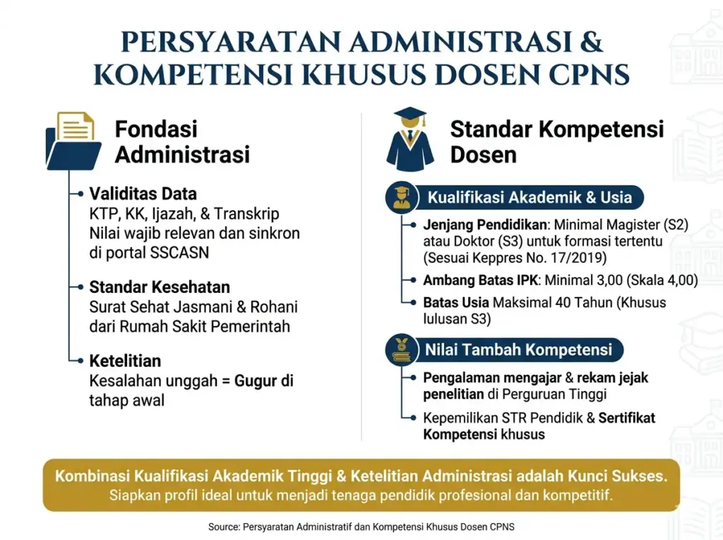 Dari sisi kompetensi, lulusan minimal Magister (S2) menjadi syarat dasar, sementara formasi tertentu mewajibkan pendidikan Doktor (S3) sesuai Keputusan Presiden nomor 17 tahun 2019. Pengalaman mengajar dan penelitian di perguruan tinggi memperkuat kelayakan calon dosen.