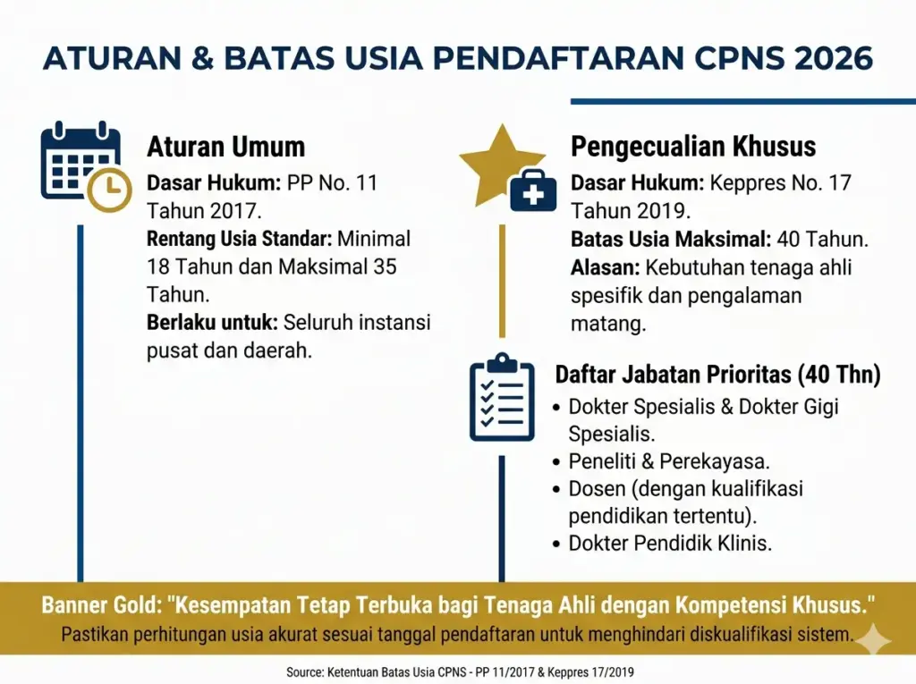 Peraturan Pemerintah Nomor 11 Tahun 2017 Pasal 23 mengatur batas usia pendaftaran CPNS minimal 18 tahun dan maksimal 35 tahun. Ketentuan ini berlaku di seluruh instansi pusat maupun daerah tanpa kecuali. Namun, sebenarnya ada ruang bagi beberapa jabatan khusus yang bisa mendapatkan perpanjangan usia sampai 40 tahun.