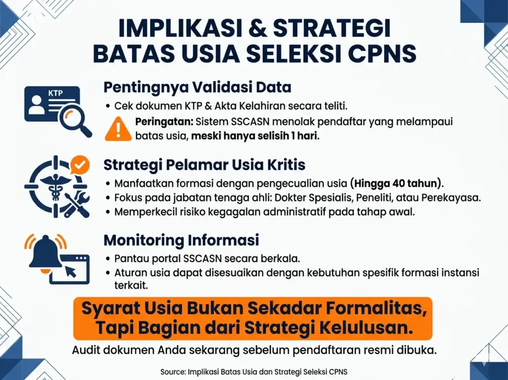 Pelamar yang mendekati batas maksimal usia dapat memperbesar peluang dengan menargetkan jabatan yang memperbolehkan pengecualian usia, khususnya bagi lulusan bidang medis dan teknologi seperti dokter spesialis atau perekayasa. Pendekatan ini membantu menghindari risiko kegagalan administratif.